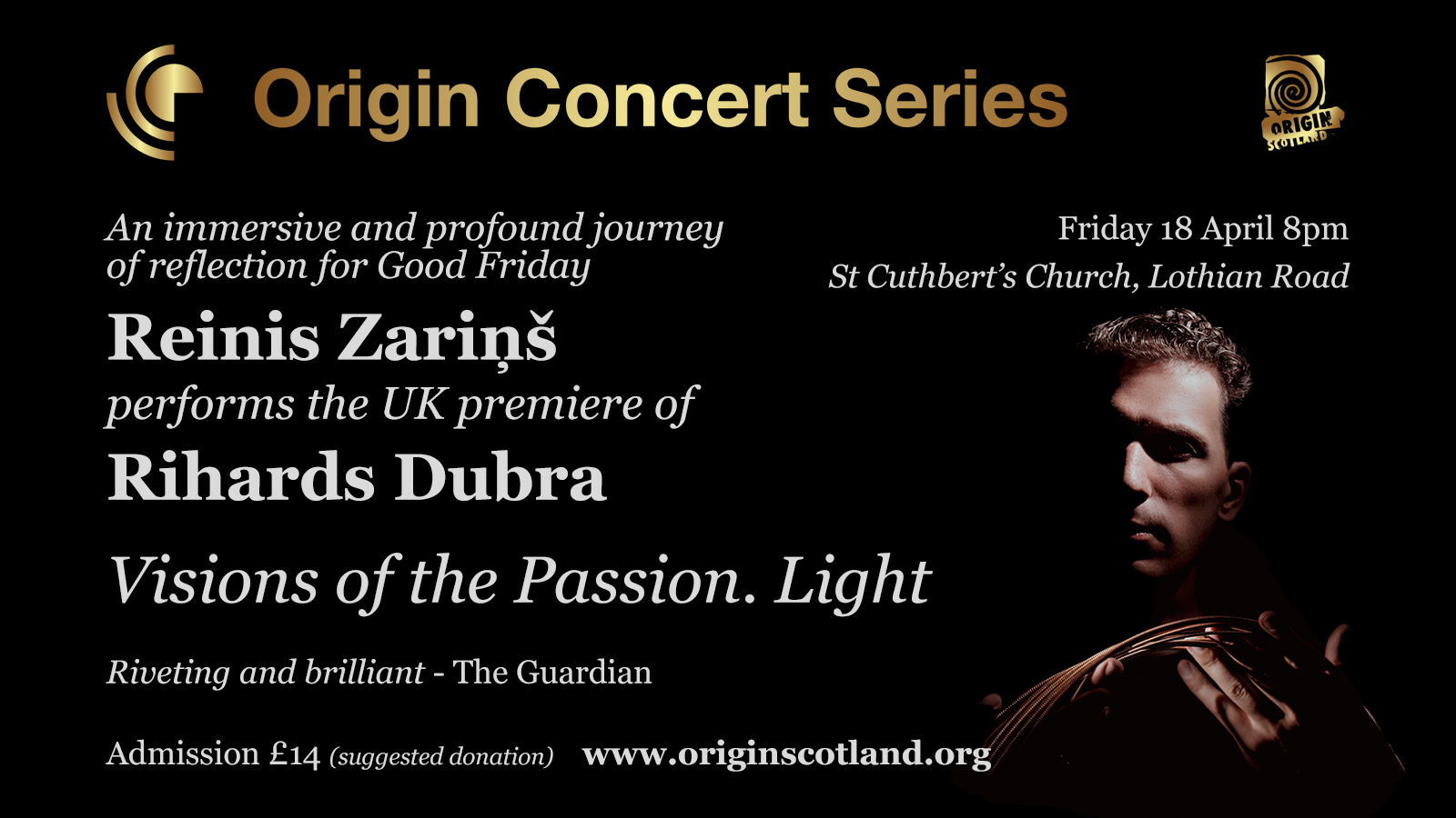 Visions of the Passion. Light is possibly the world's first work for solo piano based on the Stations of the Cross. Its monumental design and deeply personal expression intertwine to create a powerful listening experience. The work has been commissioned by the Latvian pianist Reinis Zariņš who gives the work its UK premiere on Good Friday this year.